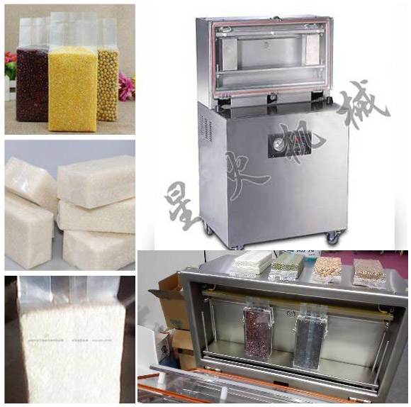適用于粉狀及顆粒狀包裝物如大米、雜糧、大棗、花生、面粉、茶葉等包裝起來(lái)象磚塊樣的抽真空包裝,